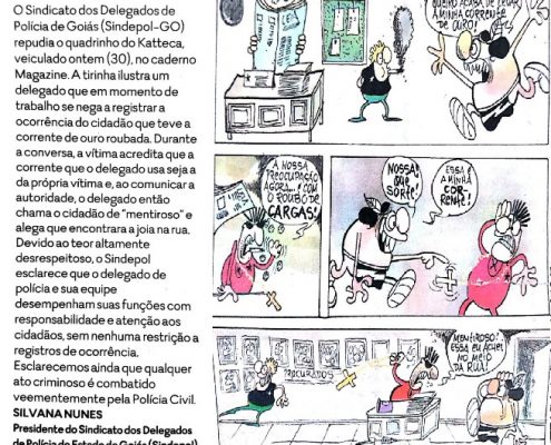 Sindepol repudia quadrinho do Katteca que calunia categoria do delegado de polícia. Tira foi veiculada hoje, (30), em O Popular